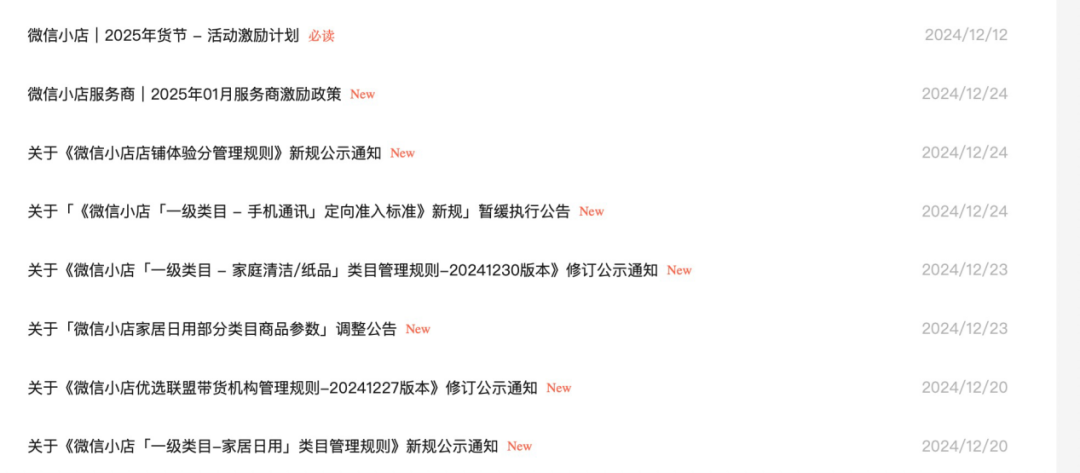 近日微信小店已公布母婴、生鲜、家居日用等多类商品的管理规则,并于12月24日公布了2025年1月的服务商激励政策。