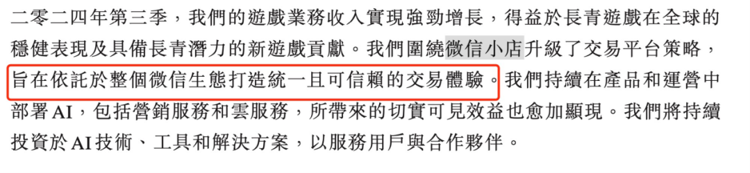 值得注意的是,在最新发布的三季度财报中,腾讯表示,公司围绕微信小店升级了交易平台策略,旨在依托于整个微信生态打造统一且可信赖的交易体验。