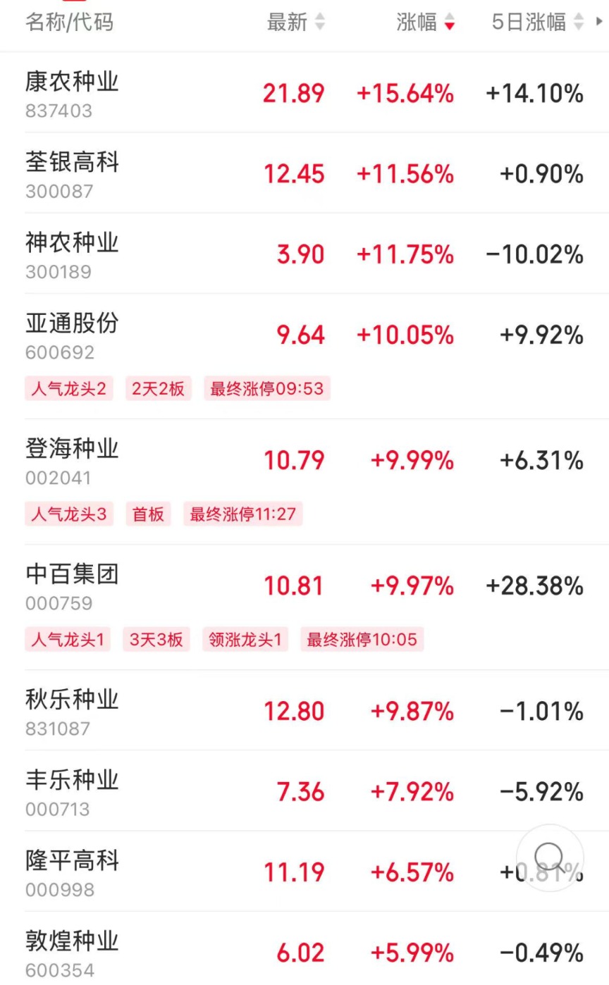早盘,农林牧渔行业指数以2.33%的涨幅居于全行业第二,主力资金净流入17亿元。个股方面,康农种业、荃银高科、神农种业涨超10%,仙坛股份、绿康生化、登海种业涨停,其他还有秋乐种业、平潭发展、丰乐种业涨7%以上。