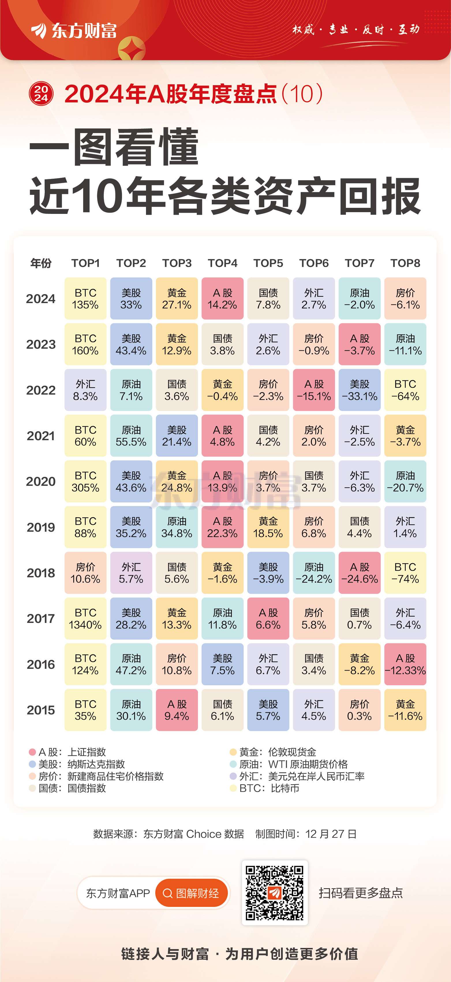 站在2024年年末,观察过去10年各大类资产表现,在各自周期中轮动,2024年比特币涨幅位于榜首;排名第二的是代表美国科技股的纳斯达克指数,涨幅超33%;黄金以27%的涨幅位列第三,而A股排名第四,今年以来涨幅超14%。