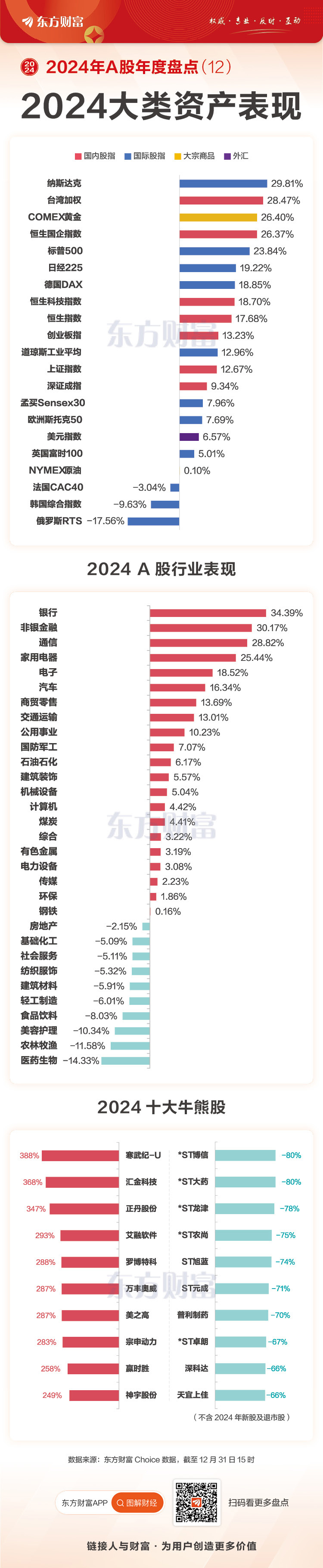 东方财富Choice数据显示,银行以34.39%的年涨幅,高居2024年行业涨幅榜之首,该行业之前连跌4年,而2024年一根大阳线,一举收复过去4年的失地。非银金融和通信行业紧随其后,年涨幅在30%左右。