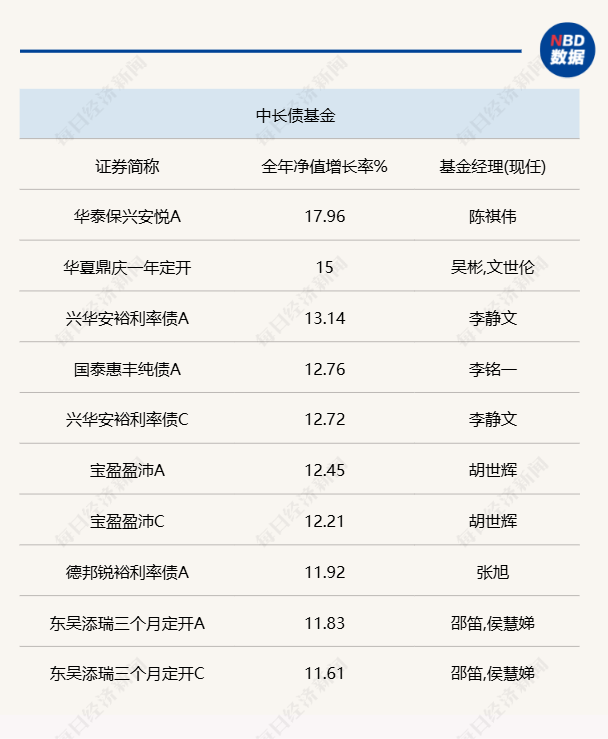 从中长债基金来看,华泰保兴安悦A、华夏鼎庆一年定开、华泰保兴安悦C等业绩排名居前,年内单位净值增长率分别录得17.96%、15.00%、14.97%。