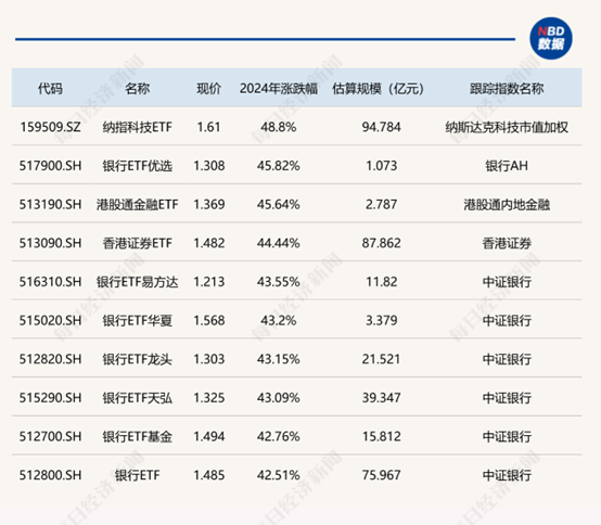 倘从上市超过一年的场内指数基金来看,银行优选ETF(517900)全年涨幅达到45.82%排名第一,紧随其后的是H股金融ETF(513190)、香港证券ETF(513090)。从跟踪的行业指数来看,银行、证券、芯片、半导体等是主要类型。