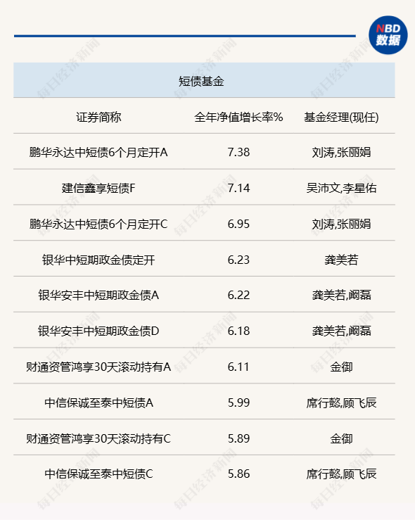 随着2024年业绩收官,纯债基金当中,短债基金的业绩冠军为鹏华永达中短债6个月定开A,年内复权单位净值增长率达到7.378%,紧随其后的是建信鑫享短债F、鹏华永达中短债6个月定开C。