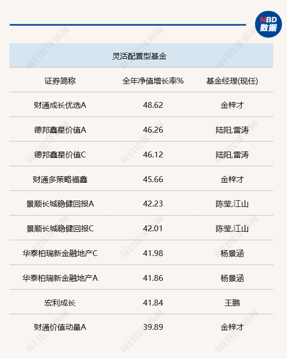 相比于偏股混合型基金,灵活配置型基金的权益仓位更加灵活,但头部产品的年度业绩差距极小。