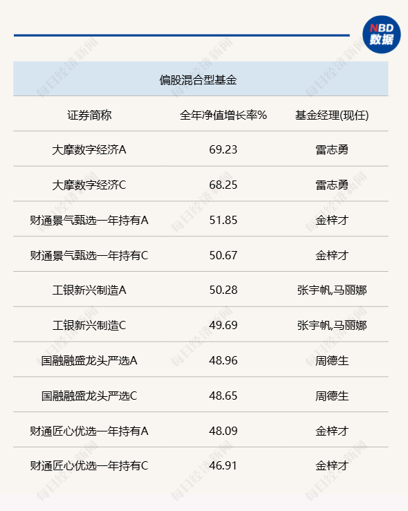 截至12月31日,偏股混合型基金中,大摩数字经济A以69.23%的成绩位列第一。
