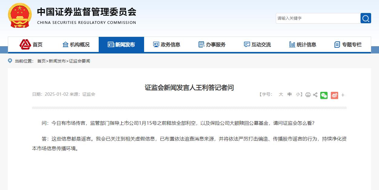 问:今日有市场传言,监管部门指导上市公司1月15号之前释放全部利空,以及保险公司大额赎回公募基金,请问证监会怎么看?