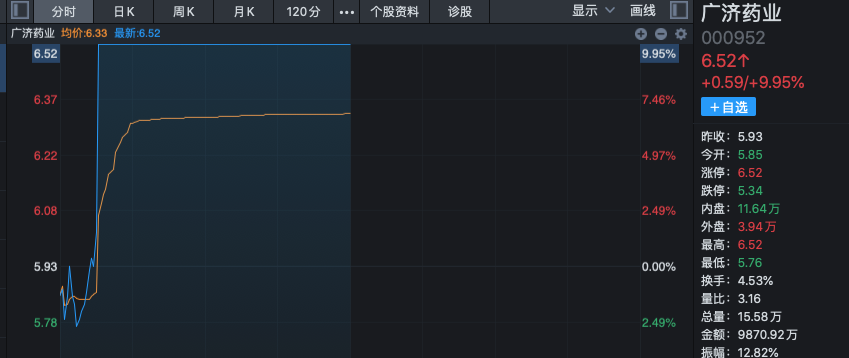医药股早间整体走强,肝炎概念领涨,板块指数高开高走,盘中一度放量涨近2%。广济药业先是小幅低开整理,在9:36左右突然放量直线拉升,不到10分钟的时间就由跌近3%垂直涨停,鲁抗医药、新华制药、哈药股份等也纷纷强势涨停。