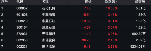 AH石油股早间联袂高开高走,A股石油板块指数放量涨近2%,石化机械、中海油服、通源石油、中曼石油等涨幅居前,“三桶油”也全线飘红。