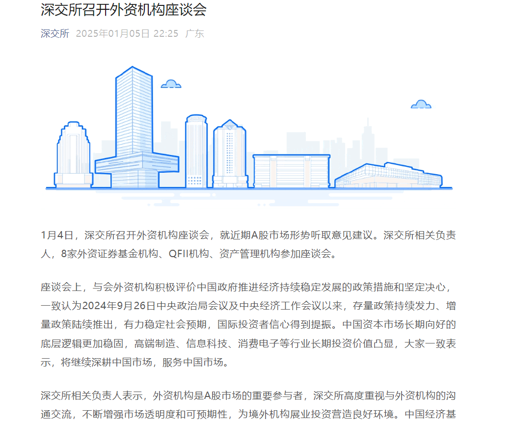 近日,沪深交易所均召开外资机构座谈会,就近期A股市场形势听取意见建议。