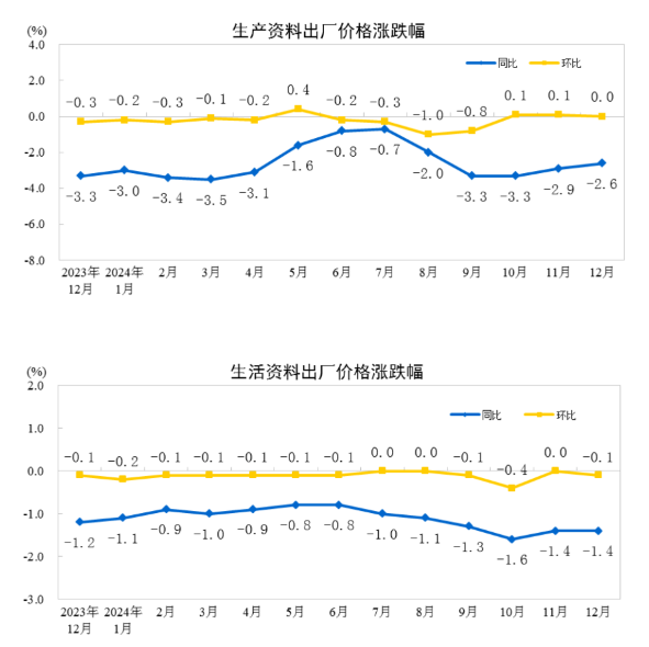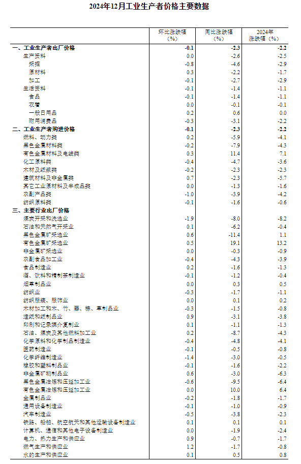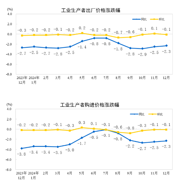 2024年12月份,全国工业生产者出厂价格和购进价格同比均下降2.3%,降幅比上月均收窄0.2个百分点;环比均下降0.1%。2024年全年,工业生产者出厂价格和购进价格均下降2.2%,降幅比上年分别收窄0.8、1.4个百分点。