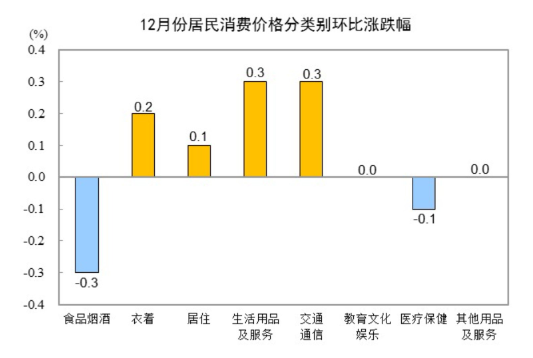 12月份,全国居民消费价格环比持平。其中,城市持平,农村下降0.1%;食品价格下降0.6%,非食品价格上涨0.1%;消费品价格下降0.1%,服务价格上涨0.1%。