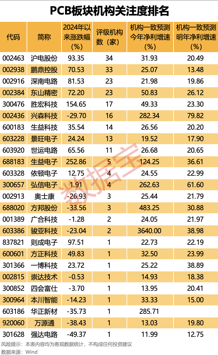 从未来成长性来看,沪电股份、东山精密、胜宏科技、生益科技等个股机构一致预测今明两年净利增速均超20%,兴森科技、生益电子、弘信电子、方邦股份等机构一致预测今明两年净利增速均超30%。
