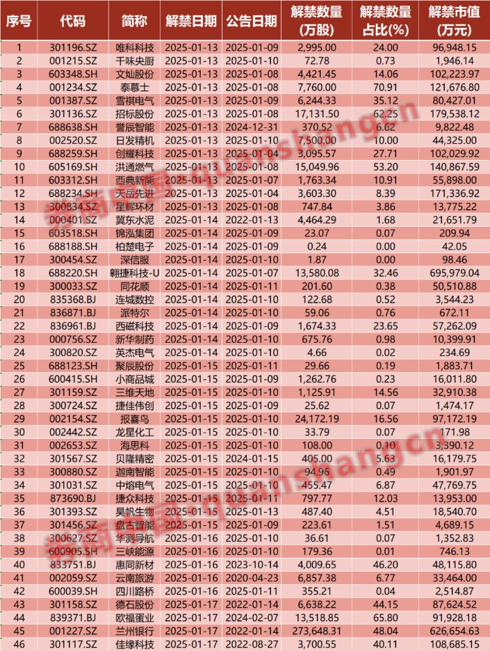 本周(1月13日到1月17日)A股市场将有46只股票面临解禁,合计解禁数量为42.97亿股,按最新收盘价计算,合计解禁市值为321.86亿元。翱捷科技-U、兰州银行解禁市值均超60亿元。