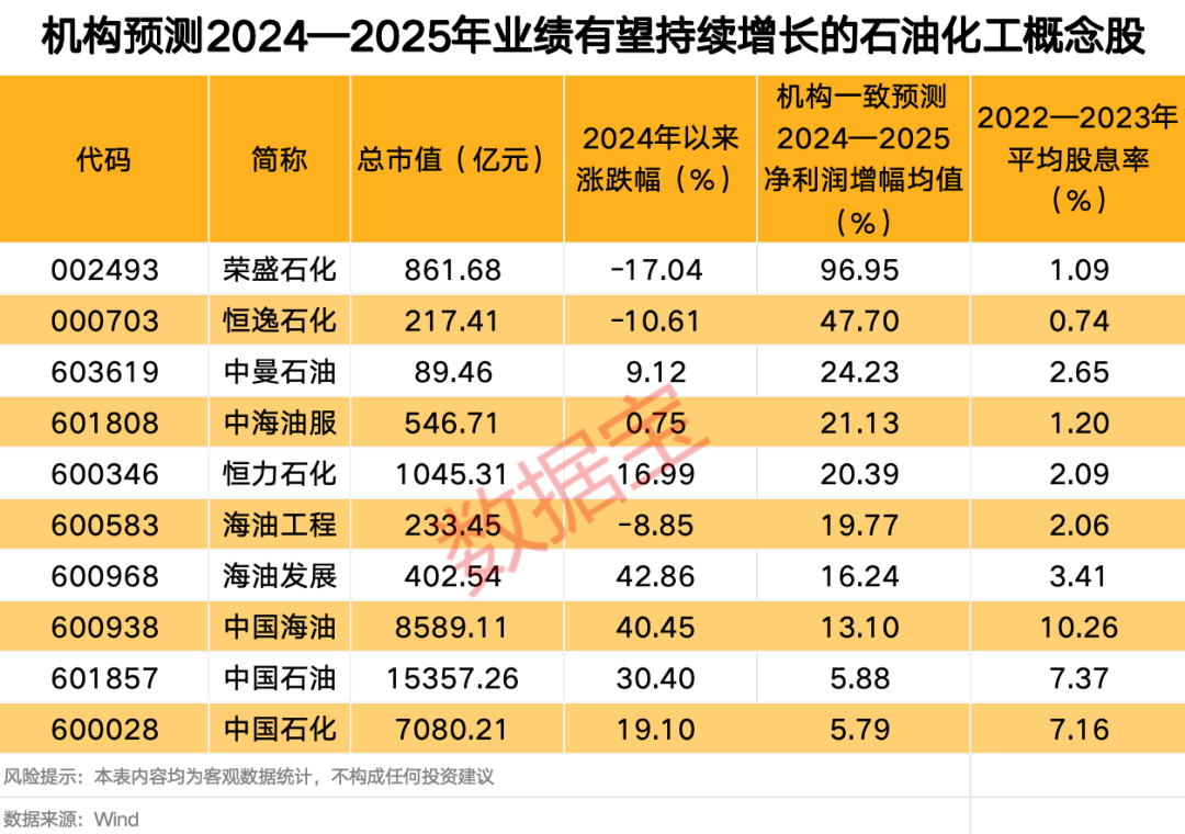 一直以来,石油化工领域以高分红高股息著称,10只业绩有望持续增长的个股中,中国海油、中国石油、中国石化、海油发展的2023—2022年度股息率水平较高,平均股息率均超3%。其中中国海油、中国石油、中国石化2024年上半年保持分红,股息率均超2%。
