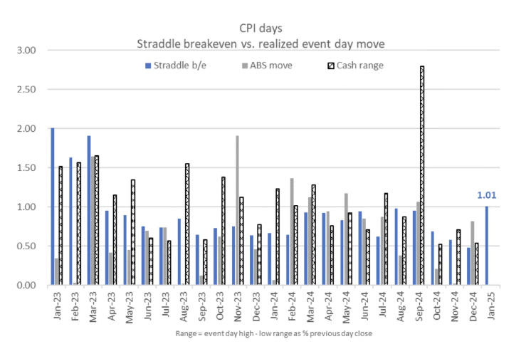 花旗集团美国股票交易策略主管Stuart Kaiser表示,根据平值看跌期权和看涨期权的成本,预计标普500指数在今晚将上下波动1%。这将是自2023年3月地区银行动荡以来CPI数据发布日该指数最大的隐含波动率。