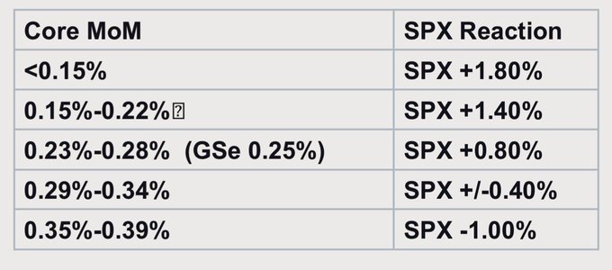 下图是高盛预计的今晚不同核心CPI环比数据表现下,标普500指数的潜在涨跌幅,可供投资者自行参考: