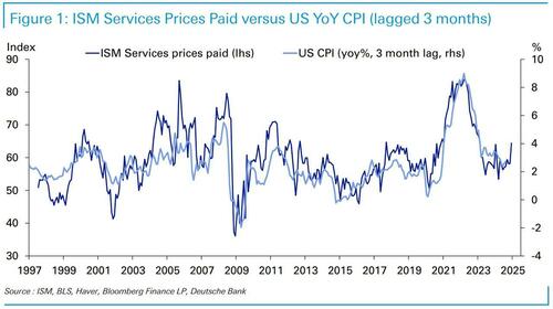 为什么这么说?我们先来看下面这张德银的图表。德意志银行的研究发现,美国ISM服务业物价指数与美国CPI数据之间存在很强的相关性。一般而言,ISM服务业物价指数会领先CPI数据三个月——所以下图中把ISM服务业物价指数与向前平移三个月的CPI进行对比,两者能呈现出高度的重合性。