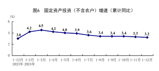 全年全国固定资产投资(不含农户)514374亿元,比上年增长3.2%;扣除房地产开发投资,全国固定资产投资增长7.2%。分领域看,基础设施投资增长4.4%,制造业投资增长9.2%,房地产开发投资下降10.6%。全国新建商品房销售面积97385万平方米,下降12.9%;新建商品房销售额96750亿元,下降17.1%。分产业看,第一产业投资增长2.6%,第二产业投资增长12.0%,第三产业投资下降1.1%。民间投资下降0.1%;扣除房地产开发投资,民间投资增长6.0%。高技术产业投资增长8.0%,其中高技术制造业、高技术服务业投资分别增长7.0%、10.2%。高技术制造业中,航空、航天器及设备制造业,计算机及办公设备制造业投资分别增长39.5%、7.1%;高技术服务业中,专业技术服务业、科技成果转化服务业投资分别增长30.3%、11.4%。12月份,固定资产投资(不含农户)环比增长0.33%。