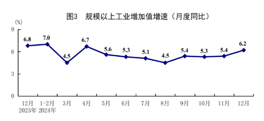 全年全国规模以上工业增加值比上年增长5.8%。分三大门类看,采矿业增加值增长3.1%,制造业增长6.1%,电力、热力、燃气及水生产和供应业增长5.3%。装备制造业增加值增长7.7%,高技术制造业增加值增长8.9%,增速分别快于规模以上工业1.9、3.1个百分点。分经济类型看,国有控股企业增加值增长4.2%;股份制企业增长6.1%,外商及港澳台投资企业增长4.0%;私营企业增长5.3%。分产品看,新能源汽车、集成电路、工业机器人产品产量分别增长38.7%、22.2%、14.2%。四季度,规模以上工业增加值同比增长5.7%。12月份,规模以上工业增加值同比增长6.2%,环比增长0.64%。1—11月份,全国规模以上工业企业实现利润总额66675亿元,同比下降4.7%。
