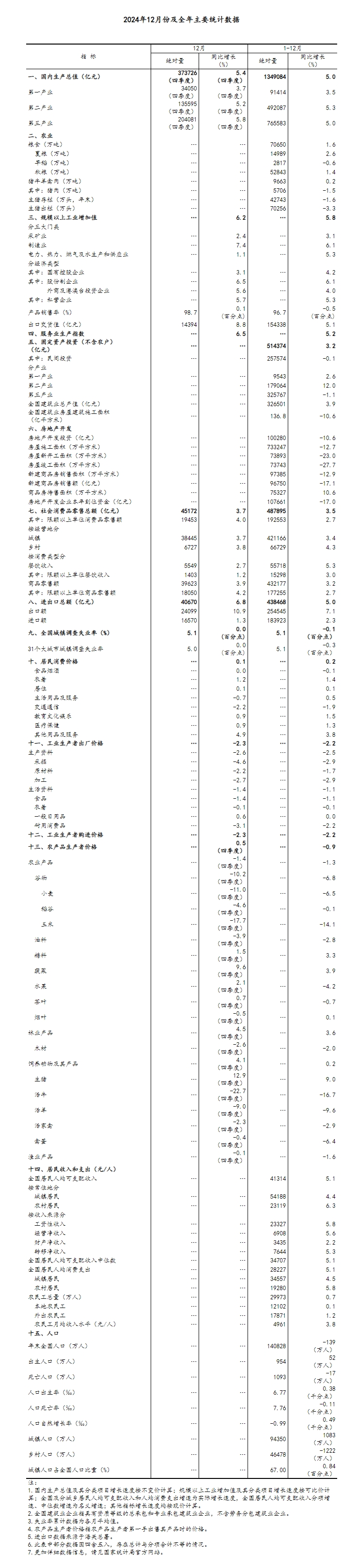 初步核算,全年国内生产总值1349084亿元,按不变价格计算,比上年增长5.0%。分产业看,第一产业增加值91414亿元,比上年增长3.5%;第二产业增加值492087亿元,增长5.3%;第三产业增加值765583亿元,增长5.0%。分季度看,一季度国内生产总值同比增长5.3%,二季度增长4.7%,三季度增长4.6%,四季度增长5.4%。从环比看,四季度国内生产总值增长1.6%。