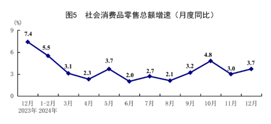 全年社会消费品零售总额487895亿元,比上年增长3.5%。按经营单位所在地分,城镇消费品零售额421166亿元,增长3.4%;乡村消费品零售额66729亿元,增长4.3%。按消费类型分,商品零售额432177亿元,增长3.2%;餐饮收入55718亿元,增长5.3%。基本生活类和部分升级类商品销售增势较好,全年限额以上单位家用电器和音像器材类、体育娱乐用品类、通讯器材类、粮油食品类商品零售额分别增长12.3%、11.1%、9.9%、9.9%。全国网上零售额155225亿元,比上年增长7.2%。其中,实物商品网上零售额130816亿元,增长6.5%,占社会消费品零售总额的比重为26.8%。四季度,社会消费品零售总额同比增长3.8%。12月份,社会消费品零售总额同比增长3.7%,环比增长0.12%。全年服务零售额比上年增长6.2%。