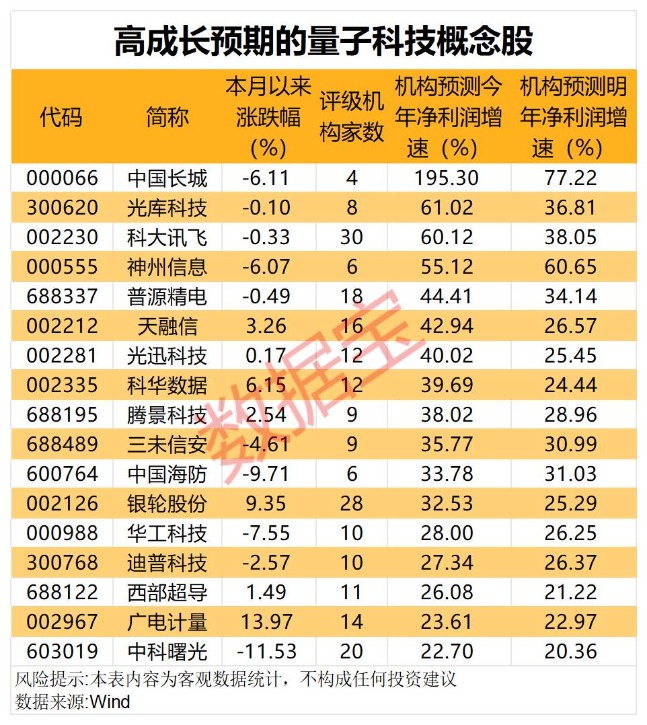 鉴于未来广阔的市场规模前景,部分个股未来成长性值得期待。根据3家以上机构一致预测,有17股今明两年净利增速有望超过20%。其中,科大讯飞、普源精电、三未信安、光库科技、中国长城等机构一致预测今明两年净利增速均超30%。