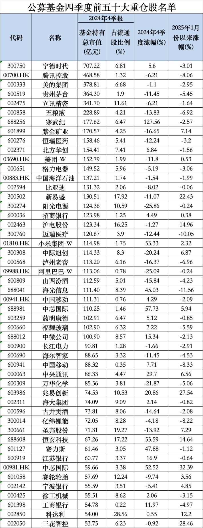 天相投顾数据显示,截至2024年四季度末,纳入统计的5179只积极投资偏股型基金的前十大重仓股分别为:宁德时代、腾讯控股、美的集团、贵州茅台、立讯精密、五粮液、寒武纪、紫金矿业、恒瑞医药、北方华创。
