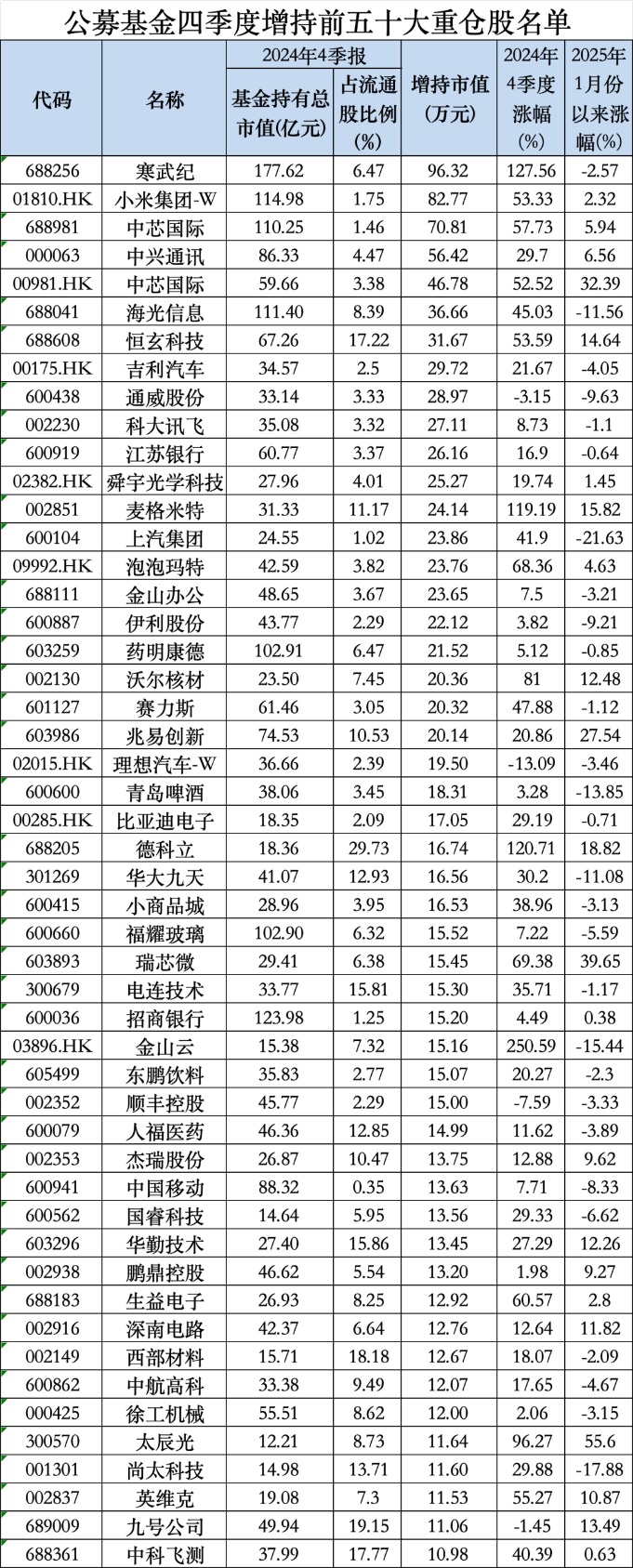 除了寒武纪之外,小米集团、中兴通讯以及在A股及H股上市的中芯国际也被公募基金显著增持,位居公募基金四季度增持榜前五名。