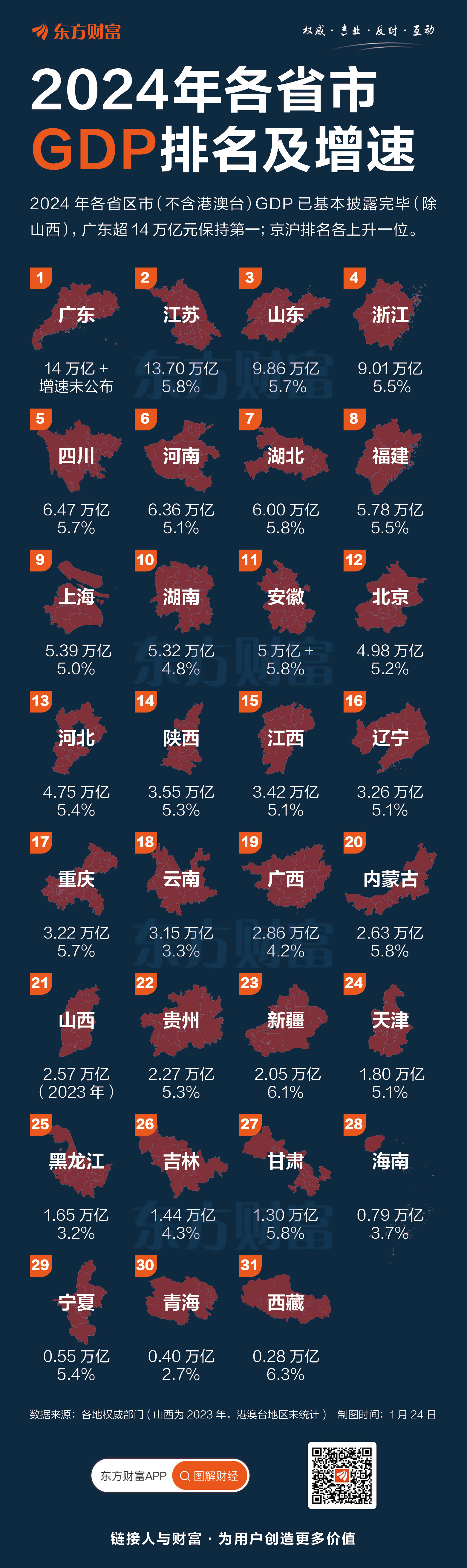 截至1月24日,各省市2024年GDP数据已基本披露完毕(除山西)。根据GDP由高至低排列,2024年中国经济十强为:广东、江苏、山东、浙江、四川、河南、湖北、福建、上海、湖南。