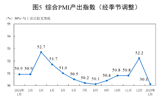 1月份,综合PMI产出指数为50.1%,比上月下降2.1个百分点,表明我国经济总体产出继续保持扩张。