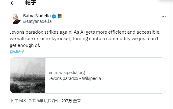 面对冲击,科技巨头们迅速做出反应,微软首席执行官纳德拉在社交媒体X上发文,引用了杰文斯悖论(Jevons paradox)的概念,指出随着人工智能更加高效和易用,其使用将会激增,并成为“我们永远无法满足的商品”。