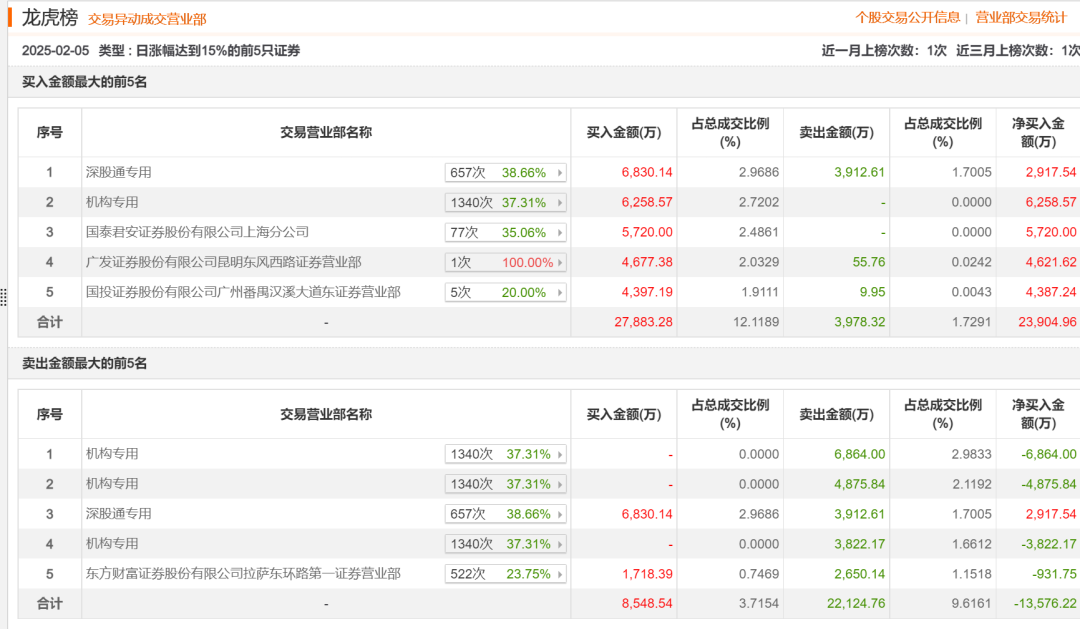 2月6日,由于连续3个交易日内,涨幅偏离值累计达到30%,光线传媒又一次公布龙虎榜。数据显示,2家机构合计净买入超1.7亿元,另有一家机构净卖出近7000万元。