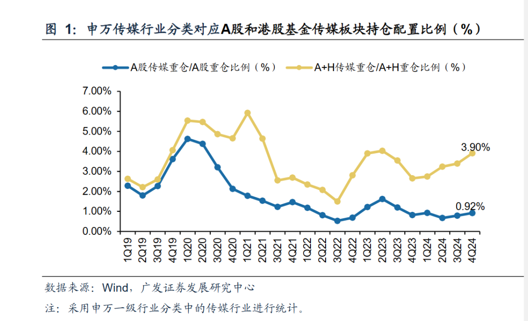 从公募对传媒行业的配置来看,据广发证券测算,截至去年底,主动权益类基金对A股传媒板块的重仓配置比例为0.92%,较去年三季度末的0.79%环比增长0.13个百分点。