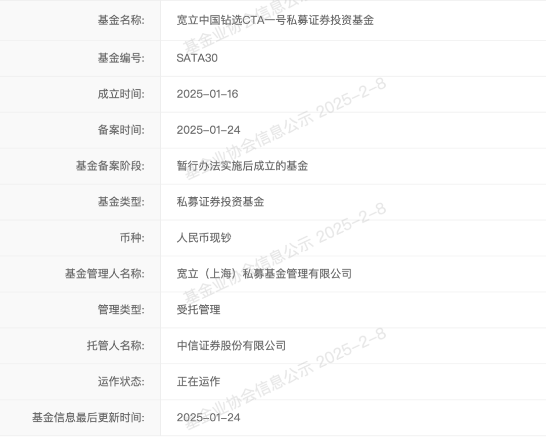 中国证券投资基金业协会的数据显示,宽立中国钻选CTA一号私募证券投资基金于今年1月16日成立,并于今年1月24日完成备案。基金类型为私募证券投资基金,托管人为中信证券。