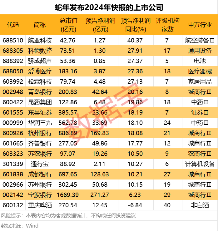 从净利润变动来看,航亚科技以增速40.37%排在首位;科德数控、骄成超声、爱博医疗、松霖科技净利润增速均在27%以上;青岛银行净利润增幅也超过20%。