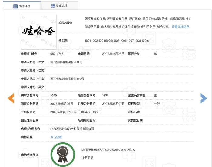 2月11日,界面新闻通过国家知识产权局商标局官网发现,杭州娃哈哈集团有限公司正在对“娃哈哈”商标进行转让,目前“申请收文”环节已结束,申请日期为2025年1月21日,而商标的受让主体未显示。