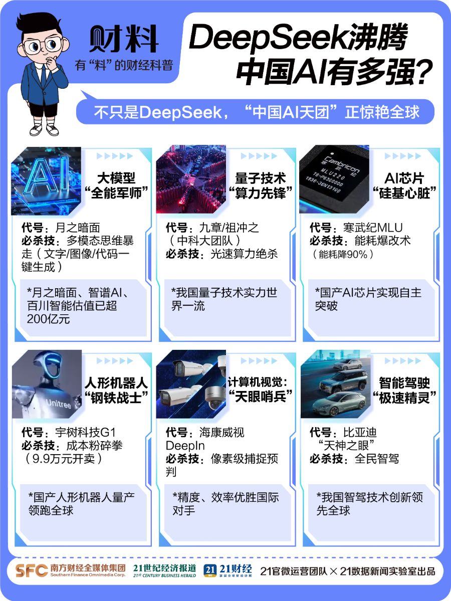 不仅是DeepSeek,来自东方的“AI天团”正集体惊艳世界:日前,中国自主超导量子计算机“本源悟空”全球访问量突破2000万次,刷新我国算力服务规模纪录;比亚迪“天神之眼”成中国智驾新亮点,还有月之暗面、智谱AI、百川智能迅速成长为估值超200亿元的AI巨头……这些都在彰显中国AI产业的硬核实力。