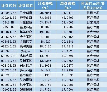 其实,不仅是美年健康,卫宁健康、迪安诊断、阿里健康、医渡科技、华大基因、金域医学、嘉和美康等股票在最近一月内的涨跌幅均超过或者接近50%。