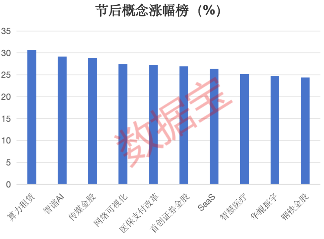 近期相关板块个股也大幅飙升。从节后表现来看,算力租赁指数大涨近31%高居概念板块涨幅榜首位;东数西算大涨近24%,大数据、服务器等概念指数均涨超20%。牛股表现令人咋舌,并行科技月内大涨两倍高居A股第一,优刻得-W、青云科技-U等大涨超170%。