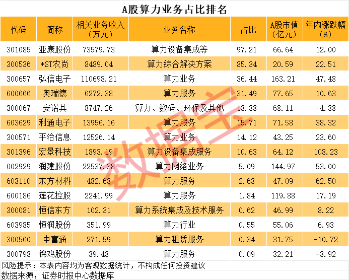 从2024年半年报数据来看,有15家A股公司披露算力业务相关数据。其中,弘信电子算力业务收入超11亿元居首;亚康股份、润建股份等个股收入均超亿元。从占比来看,亚康股份位居第一,算力相关业务收入7.36亿元,占比达97.21%。此外,*ST农尚、弘信电子、奥瑞德等个股算力业务收入占比均超30%。
