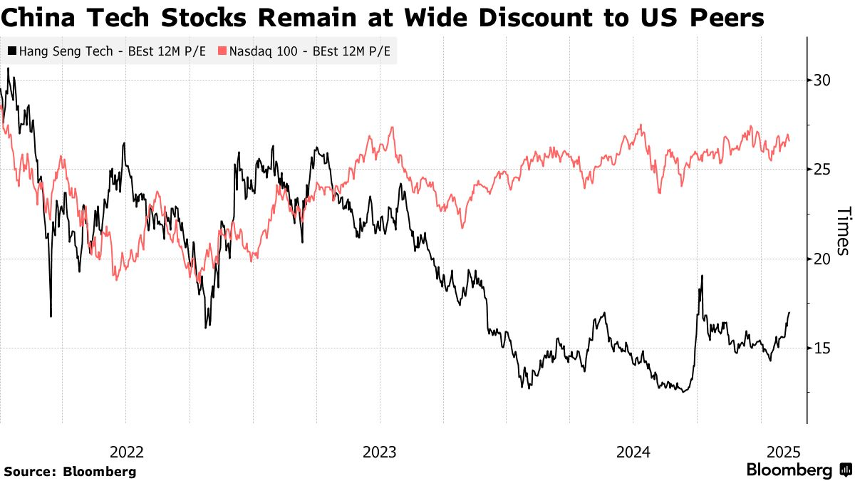 海外市场投资者也在重估中国科技股资产,有美国分析师梳理了中国“科技十姐妹”(即阿里巴巴、腾讯、美团、小米、比亚迪、京东、网易、百度、吉利和中芯国际),称它们自2023年年底至2025年2月12日的累计涨幅已超过美股“科技七巨头”(即苹果、微软、Alphabet、特斯拉、Meta、英伟达和亚马逊)同期的表现。