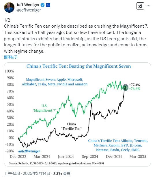 Jeff Weniger在推文中贴的表格显示,2023年12月31日至2025年2月12日,中国“科技十姐妹”的累计涨幅为77.4%,而同期美股“科技七巨头”的涨幅为76.6%。