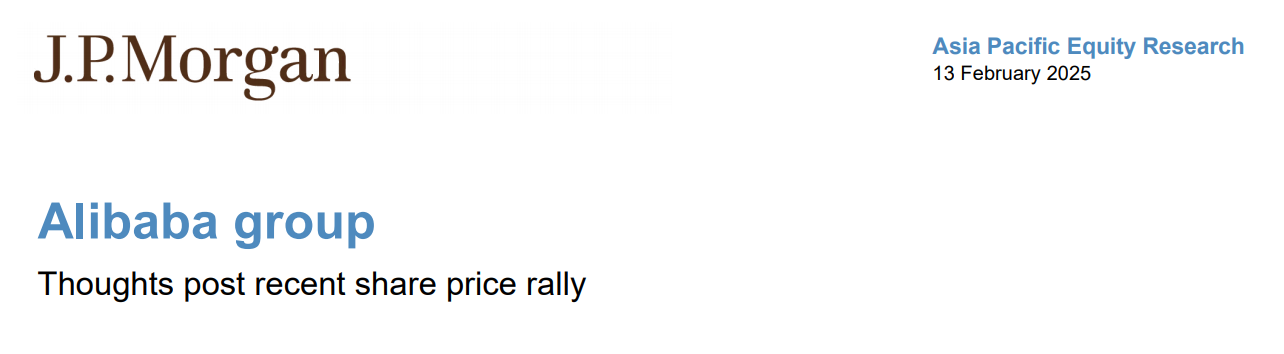 摩根大通认为,这次反弹背后反映出市场对阿里云日益乐观的看法,尤其是对其在生成式AI领域的发展和未来财务回报的预期。上周(2月10日~14日),阿里巴巴-W大涨近24%,较今年1月中旬的低点累计反弹超过50%,而市场几乎没有上调盈利预期,这说明阿里巴巴还在被低估。