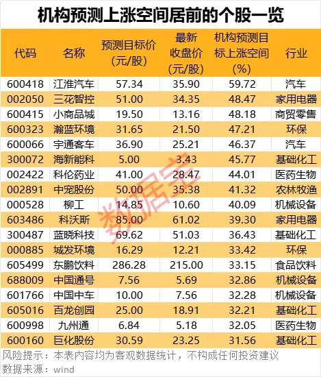 证券时报网讯,本周机构评级的个股中,18股机构预测目标价较最新收盘价上涨空间超30%,其中江淮汽车机构预测上涨空间近60%。