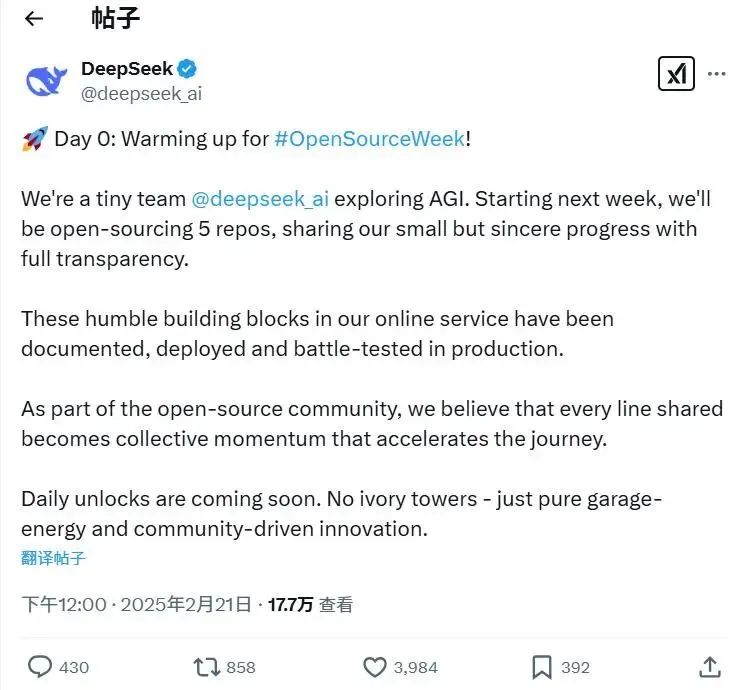 值得注意的是,2月21日,DeepSeek在社交平台X发文称,构建了一支探索AGI(通用人工智能)小团队,从下周起将开源5个代码库,以完全透明的方式分享研究进展。