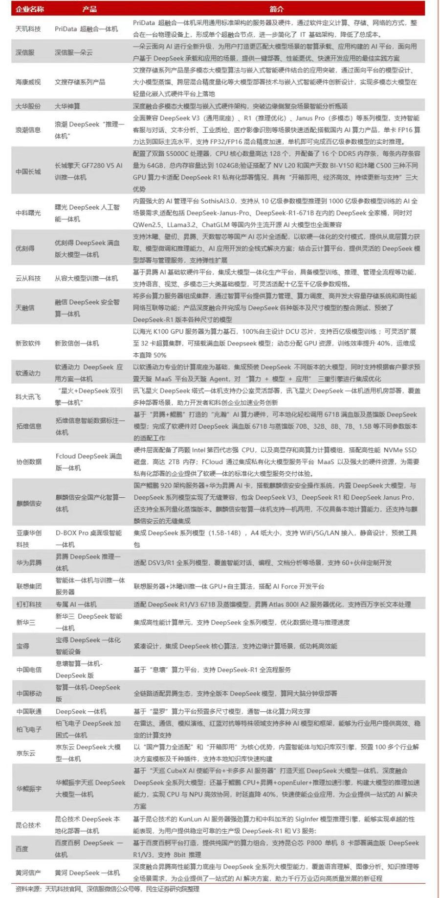 据民生证券计算团队梳理,天玑科技、深信服、海康威视、大华股份、浪潮信息、中国长城等30多家企业均推出了大模型一体机,其中以“DeepSeek”命名的约有近20家。
