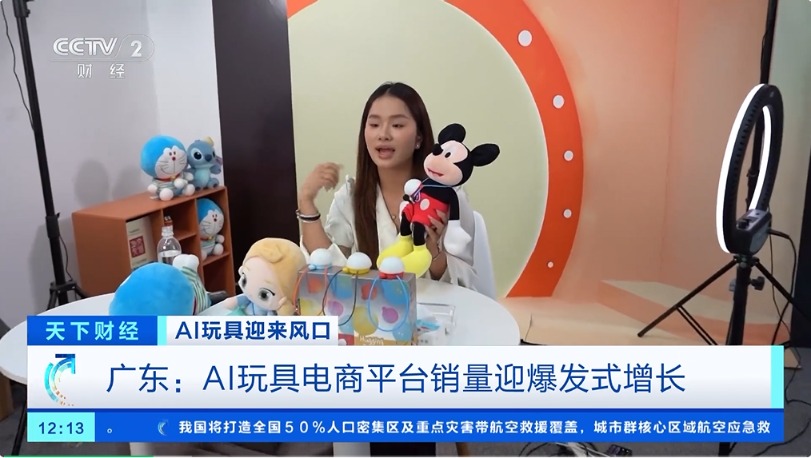 在广东深圳,一家科技公司的工作人员正在直播销售AI玩具,公司负责人告诉记者,借助线上销售渠道,今年以来,他们生产的AI玩具销量实现了快速增长。