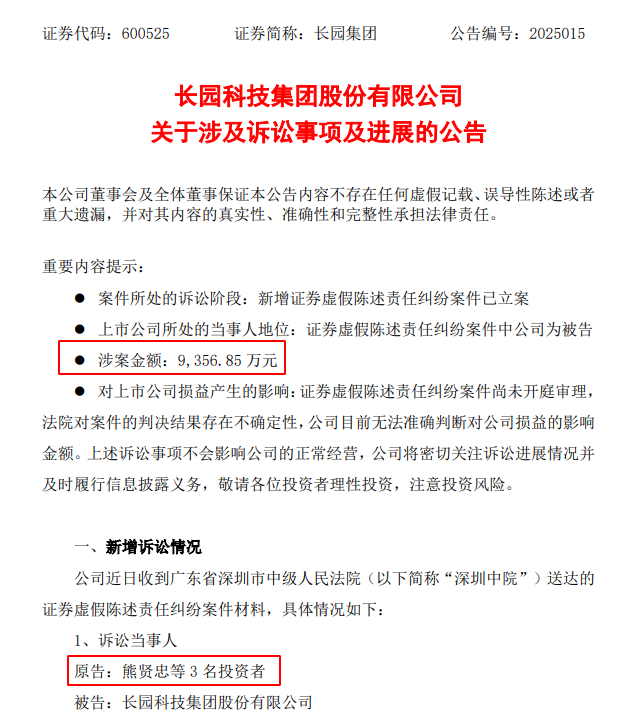 熊贤忠等人称,2020年10月23日,长园集团收到深圳证监局《行政处罚决定书》,公司2016年、2017年年度报告中披露的财务数据存在虚假记载,深圳证监局对公司给予相应处罚。其作为投资者,因公司前述信息披露违法违规行为受到损失,依据相关规定,原告申请深圳中院判令公司承担其损失。