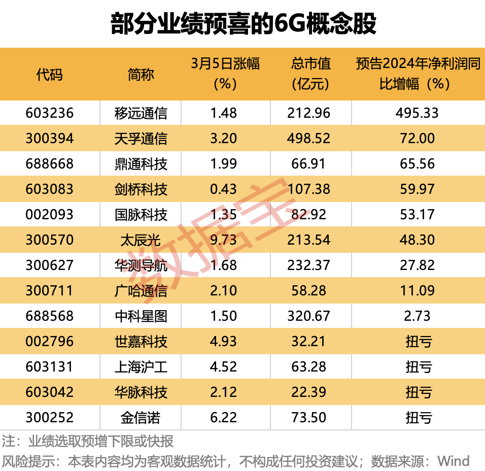 据证券时报·数据宝统计,6G概念股中,已有近30股发布2024年业绩预告或快报。以预告下限来看,业绩预喜或扭亏的有10多只个股。